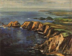 Me gusta este pintor que expone en la sala Abril. Es decente, serio y sincero. Pinta de una vez, de un tirón, sus pescadoras, sus gentes, sus paisajes. La pincelada es inmediata. El color detenido justo en ese término de discreción que es capaz de dar entidad y no se pasa. La pasta no se agolpa inútilmente. Crece tan solo donde es oportuno.