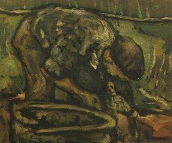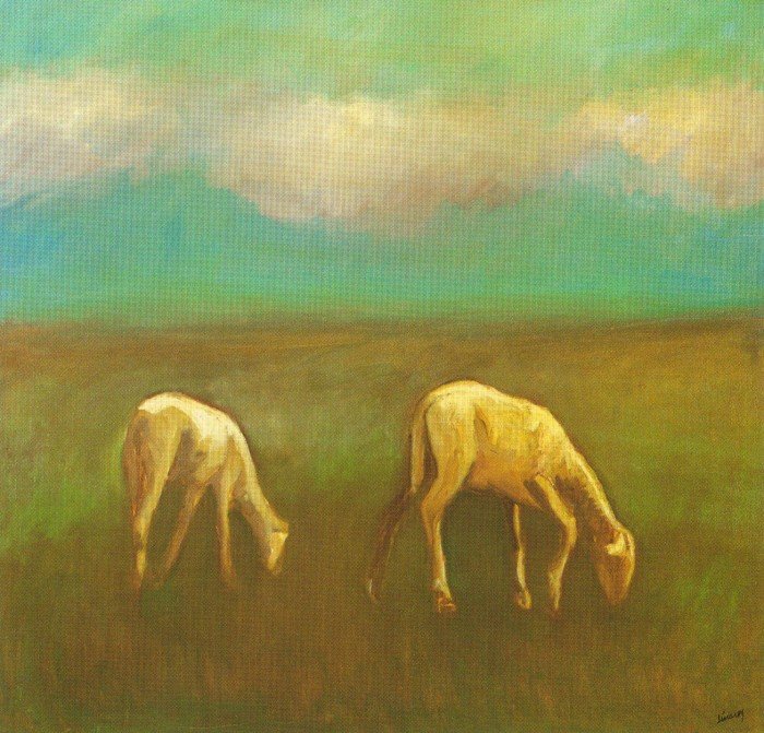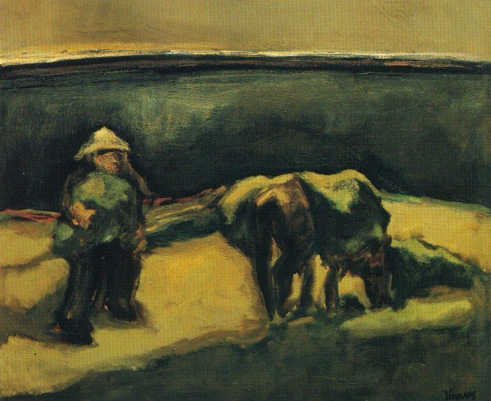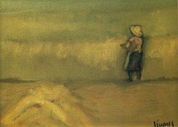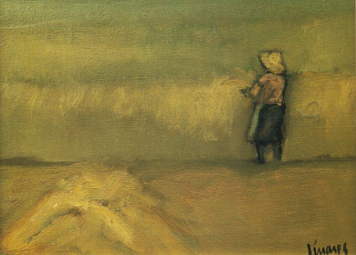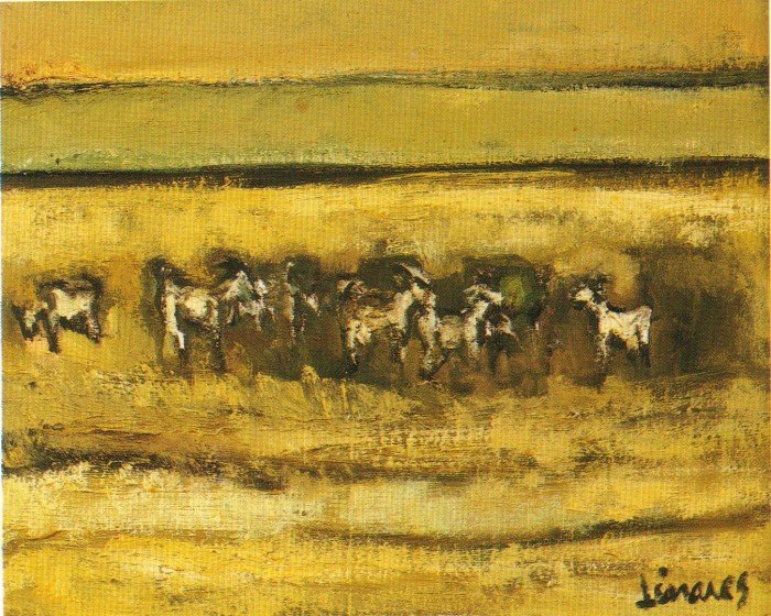 En la exposición nos encontramos en la mayoría de los casos con esos espacios abiertos de gran peso en la composición y tratados con evidente acierto plástico en suaves armonizaciones de color, con el contrapunto de pequeñas figuras que humanizan el paisaje. Parecido tratamiento traslada a las marinas en las que aún son más delicadas las matizaciones de luz y color en la definición del horizonte y el encuentro entre el agua y la arena. Junto a estos acostumbrados paisajes de radical esencialidad, aparece ahora el protagonismo de la figura en contadas obras que parecen el inicio de una nueva etapa en la que Linares retoma aquello que había hecho “hace muchos años”, expresionismo acusado entonces y matizado ahora por un naturalismo visceral más que de estilo y nutrido por la buscada identificación con las raíces.